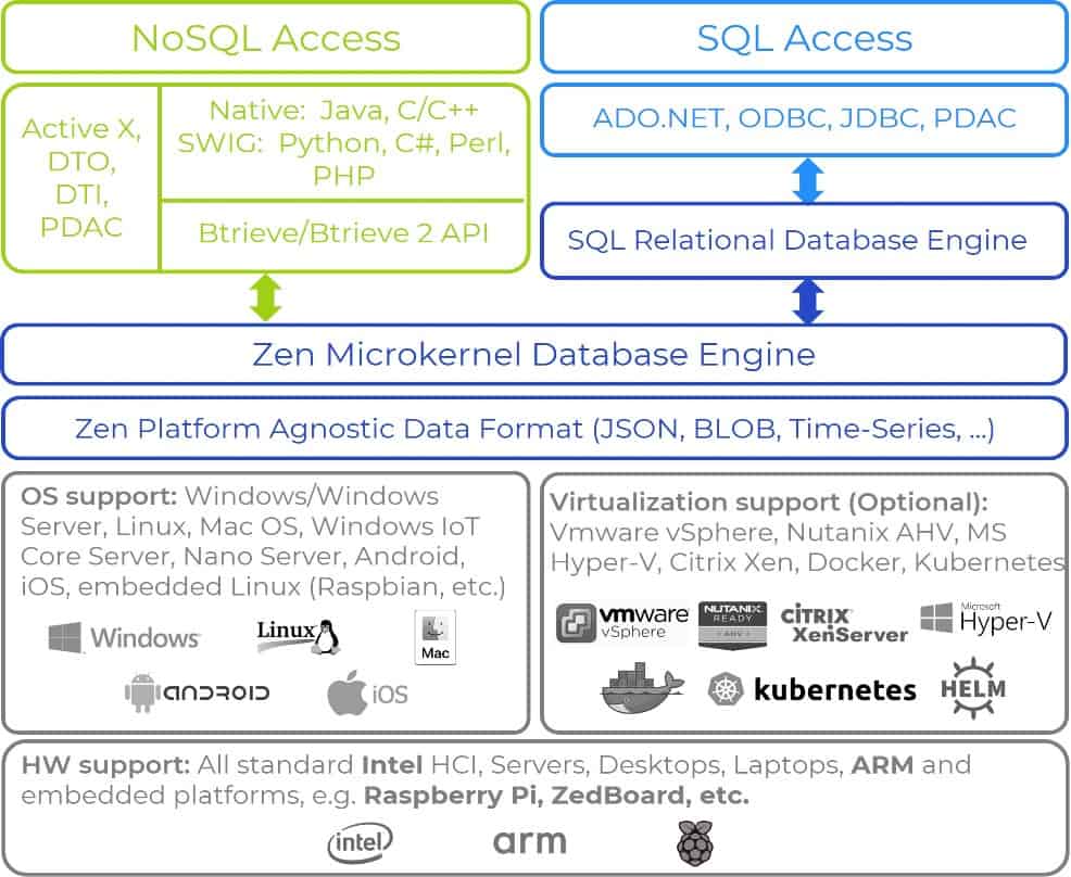 L'architettura singola, sicura e scalabile supporta la lettura e la scrittura simultanee, utilizzando NoSQL e SQL negli ambienti embedded più diffusi