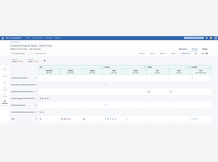 HCL DevOps Velocity의 강력한 DevOps 쿼리 언어를 사용하면 값 스트림을 모델링하여 예산 책정, 일정 및 인력 배치에 대한 보다 나은 의사 결정을 내릴 수 있습니다.