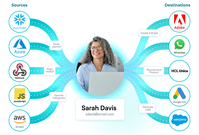 Resolva as identidades dos seus clientes em vários sistemas e crie uma visão única do cliente em toda a sua organização. Alimente e ative perfis de cliente na sua pilha de martech em tempo real.
